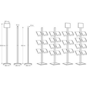 On the other hand, Dynamic Brochure Stand has square feet. If requested, we add wheels under the feet for easy transportation. The standard color of the stand is silver. The total height of the stand is between 1800 mm. and 2070 mm. depending on the extras —also, 380×380 mm. steel base for extra stability.