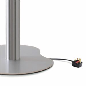 The base is 464 mm. diam. As it is large and heavy, it ensures stability. The overall dimension of the stand is 464(width) x425(depth) x1595(height) mm. It is included apparatus for the dock connector lead, camera and speaker. iPad Column home button enclosure can be designed open or concealed. The stand works with the uninterrupted power cable mounted on it.