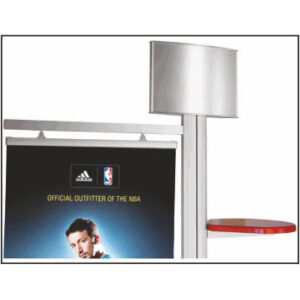 This multi-display banner and shelf stand is designed to present your visuals in with banners and products on the shelves.