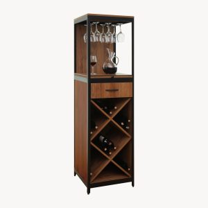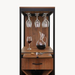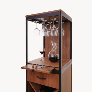 - High capacity with bottle shelf partitions, glass tray, hanging wine glass racks and board for preparing cocktails.