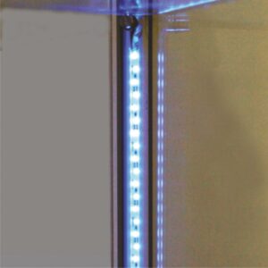 It is very durable with an anodised aluminum structure. Besides, we offer a size of 500 mm. width x 500mm. depth and 2000 mm. height. What’s more, we deliver this LED glass cabinet assembled, so you can display your products upon receiving.