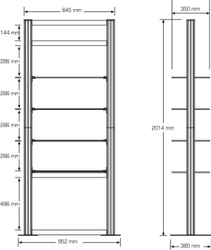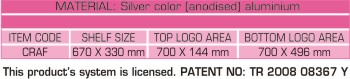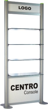 * A knockdown trade show display or a permanent retail fixture. * Elegant high-quality anodised aluminium modular console. * Header and graphics area available to print your company logo or promotional images. * 4 tempered glasses shelves each 330 mm deepth and 670 mm width. * Total height 2014 mm.