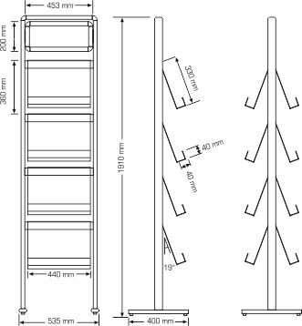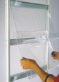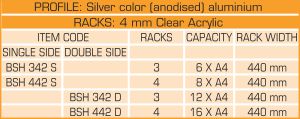 * 400 mm x 145 mm snap frame header. * Simple but functional design. * Free standing display with 25 mm x 52 mm oval profiles. * Stable T leg system. * 4 mm thick clear acrylic shelves. * Silver finish.