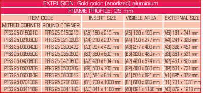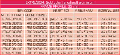 * 25mm and 32 mm extruded aluminium poster frame. * 1.3 mm strong, plastic back panel. * Anti glare poster cover, * Gold effect finish.