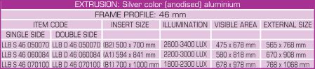 * Perfect illumination by double-chip leds, no dark spots. * Single or double sided upon requested. * Ceiling hanging accessories supplied with the double sided version. * 2 meters power cord and plug. * Each frame is packed in individual double wall carton boxes with corrugated corner supports.