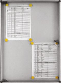 * Internal, economical magnetic lockable notice board. * Practical - perfect for use in an office for memo's and notices. * Silver anodised aluminium frame with gray plastic safety corners. * Manufactured with galvanized steel, powder coated white finish backplate. * Lockable hinged door. * 4 mm unbreakable acrylic door or 4 mm toughened glass. * Round corners due to the innovative design. * Suitable for internal use.