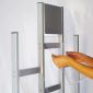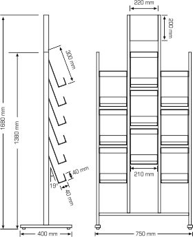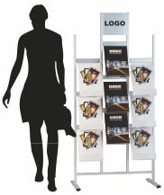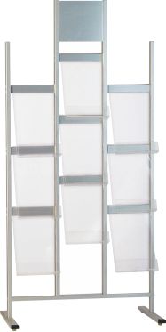 * Very functional design. * Free standing display unit with 20 mm x 40 mm box profile. * Aluminium logo header provides extra space for advertising. * 3 mm thick clear acrylic shelves * 9 x A4 capacity