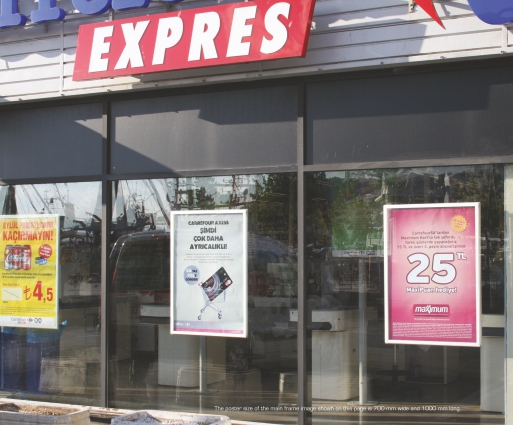 mm, 32 mm, 32 mm flat, 32 mm lockable" snap frames Window Frames have 2 antireflex PVC sheets to display the posters on both sides of a window. Window Frame back profiles hides the double sided adhesive tape that holds the snap frames on to the window. |